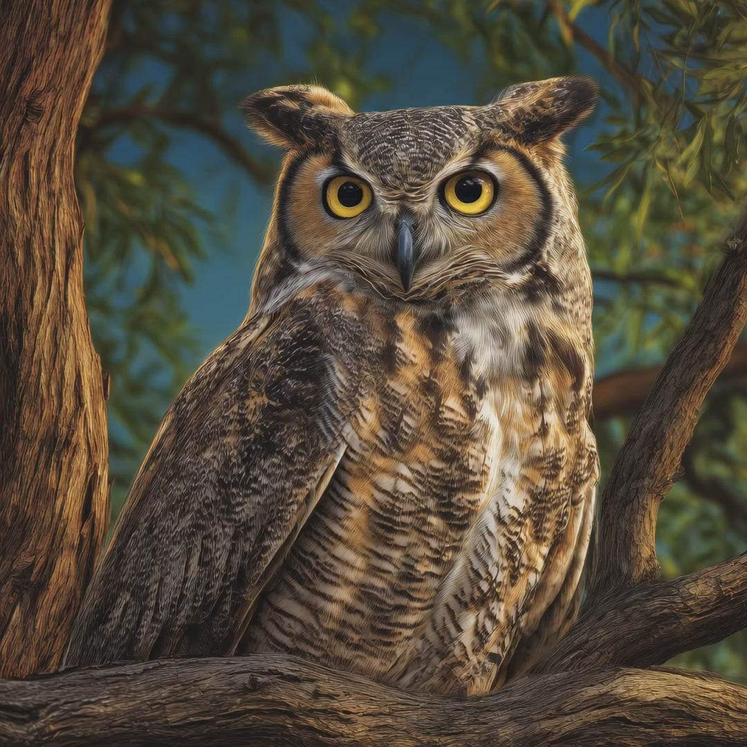 The owl seen in the image is the great horned owl (Bubo virginianus). These powerful owls are found throughout North America, from forests to deserts to city parks. They eat a wide variety of prey, including rabbits, skunks, rodents, and even other birds. Great horned owls do not build their own nests; they take over nests abandoned by hawks, crows, or squirrels. They are not endangered. In fact, they are abundant and widespread. However, they face threats from vehicle strikes, secondary poisoning from rodenticides, and disturbance near their nests. Protecting large trees and using non‑toxic pest control helps these majestic owls thrive.