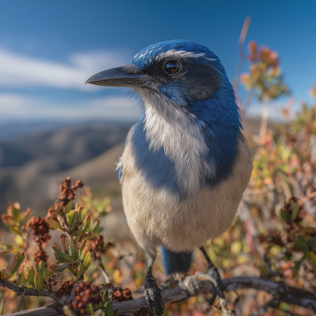 The jay seen in the image is the California scrub jay (Aphelocoma californica). This bird lives only along the Pacific Coast, from southern British Columbia to Baja California. It thrives in oak woodlands, chaparral, and suburban backyards. Scrub jays are famous for their intelligence: they stash thousands of acorns each fall, remembering where they hid them, and they sometimes fake hiding a cache if they think another jay is watching. They are not endangered, and their populations are stable. However, they are sometimes poisoned by rodenticides or killed by outdoor cats. Keeping cats indoors and avoiding rat poison helps these clever, friendly birds live long lives.